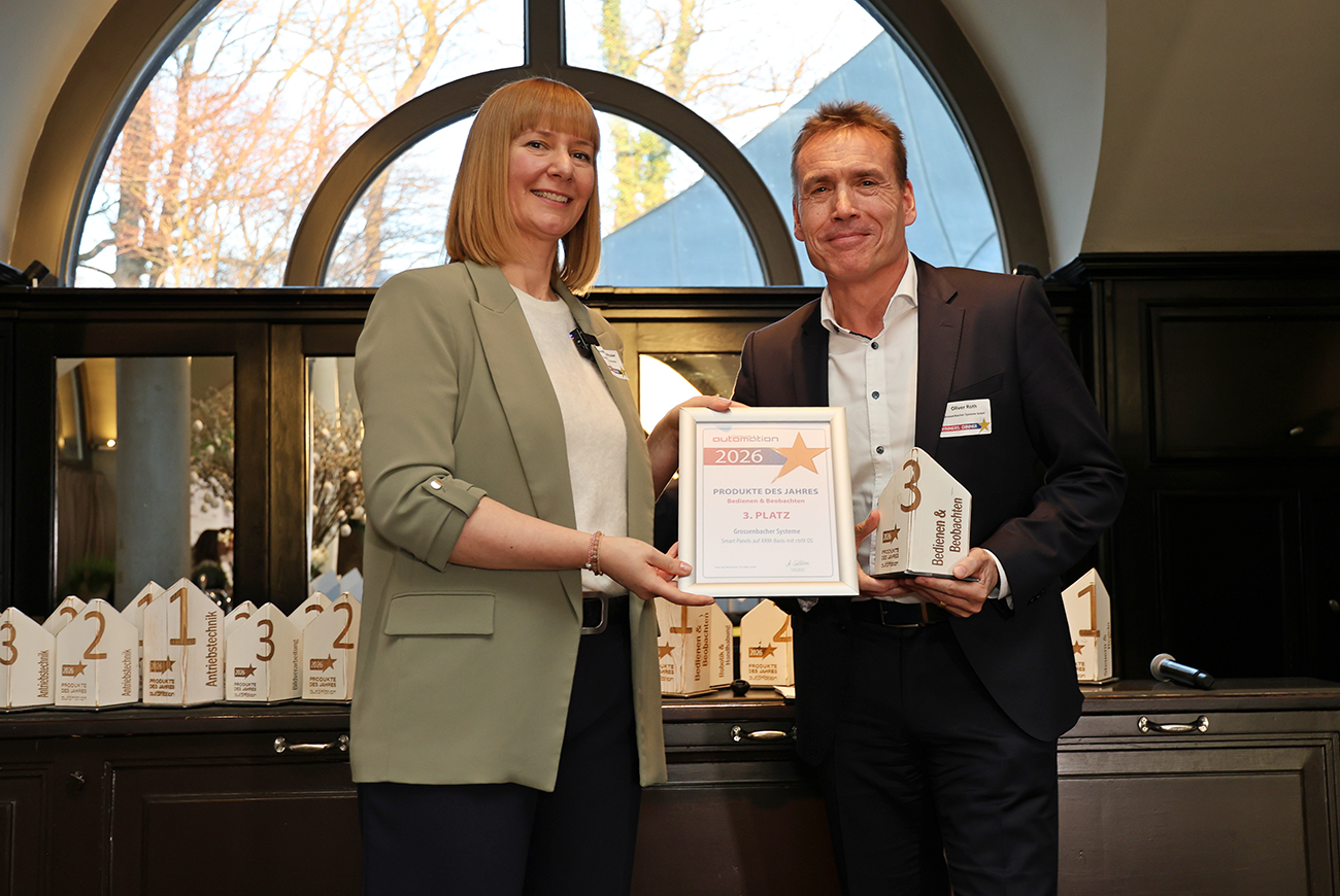 14.04.2026 | Zum Marktstart sorgen die Smart Panels mit ctrlX OS der neu gegründeten Grossenbacher Automation AG für Aufsehen. Die Multi-Touch-fähigen Geräte auf Basis neuester ARM-CPUs (i.MX 8M Mini-Prozessor) gewannen bei der Leserwahl der „Produkte des Jahres 2026" der Fachzeitschrift Computer & Automation den 3. Platz in der Kategorie „Bedienen & Beobachten”.